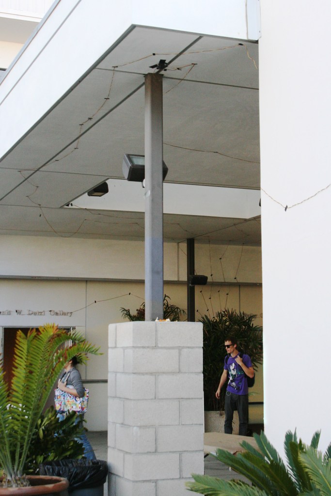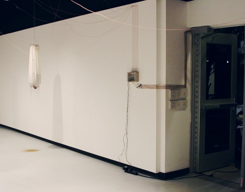 Installation Exterior View: Wires from inside to outside the gallery lead to programmed Sensor-driven Motion trigger devices that release black pepper from the bags inside