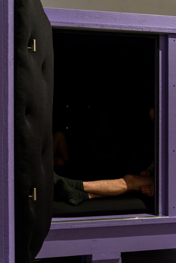 a safe place for people i love or; How I Learned To Stop Worrying and Love Weathering The Storm is an upholstered soundproof and lightproof deprivation room that participants can enter alone or with a group of people. When the room is closed, the people inside control who can enter and exit the space. This is a situated enclosure to sit out and away for a moment from the location where the work is placed.