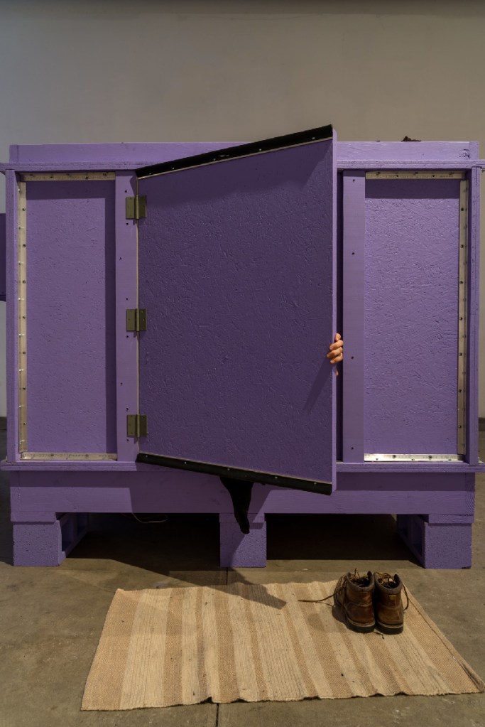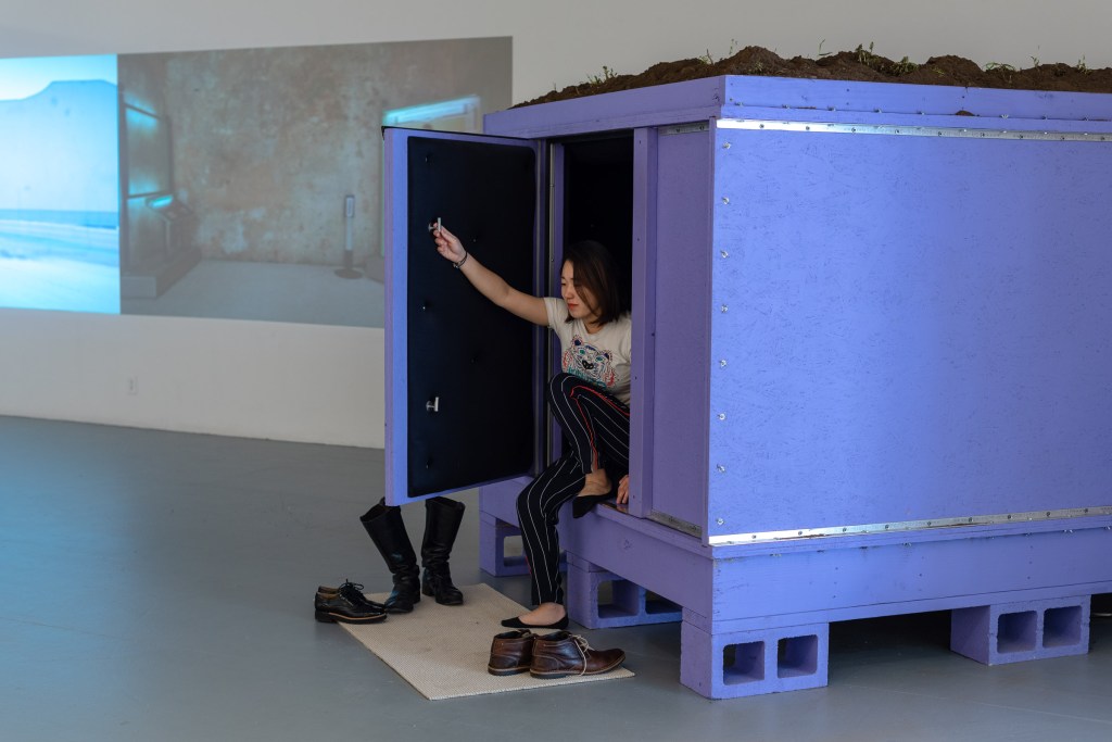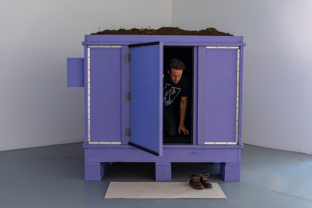 The structural details of the room are based on various types of safe spaces, including weather shelters, politically driven hiding spaces, and structures of control including spaces for therapeutic purposes or to keep society safe. The dirt on top of the room was collected from public land and returned to the earth after the exhibition.