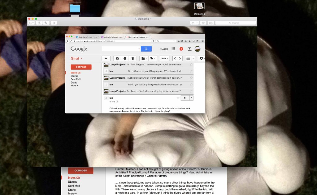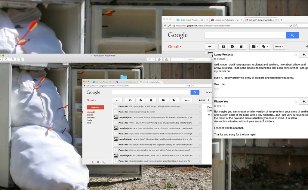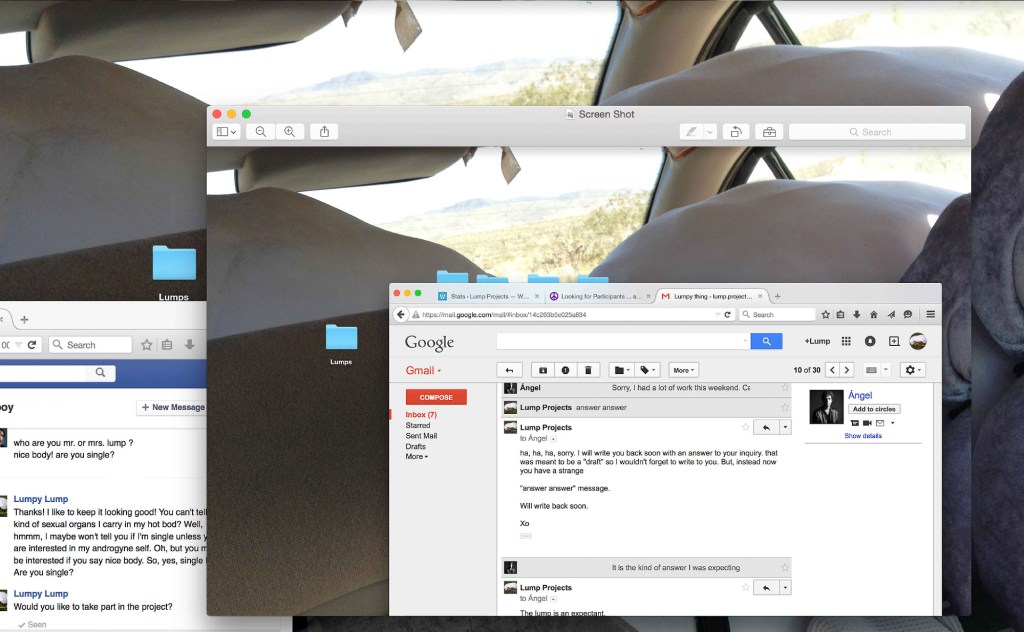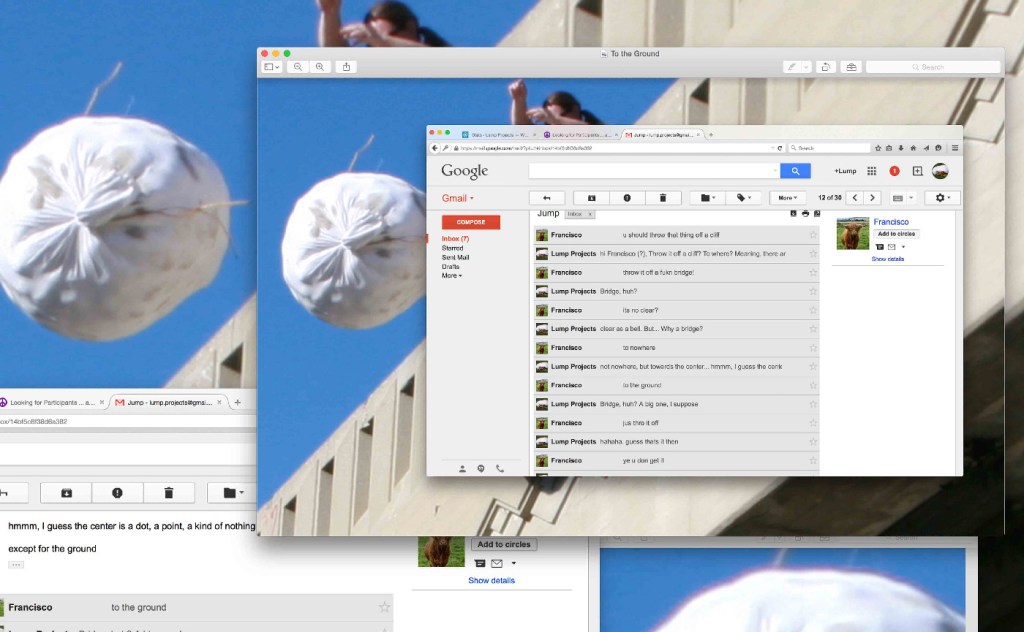 The photographs produced for Lump Projects stem from conversations that were sought out and fostered with unknown individuals online, an exercise of exchange and vulnerability between strangers. Conversations engaged with aspects of consent, trust, decision-making, improvisation, and play. Some of these conversations can be visually seen in the photographs. Drawing directly from the content of these conversations, the exhibition space and the performative acts are considered and re-visioned through enacting individualized performative documentary photographs. Each participating individual was sent back an image that was realization of the conversation. Sites of online social interactions were traversed to question how the excessive spatiality of the Internet can become reinscribed back onto material, the body, space, and photographic documentation.