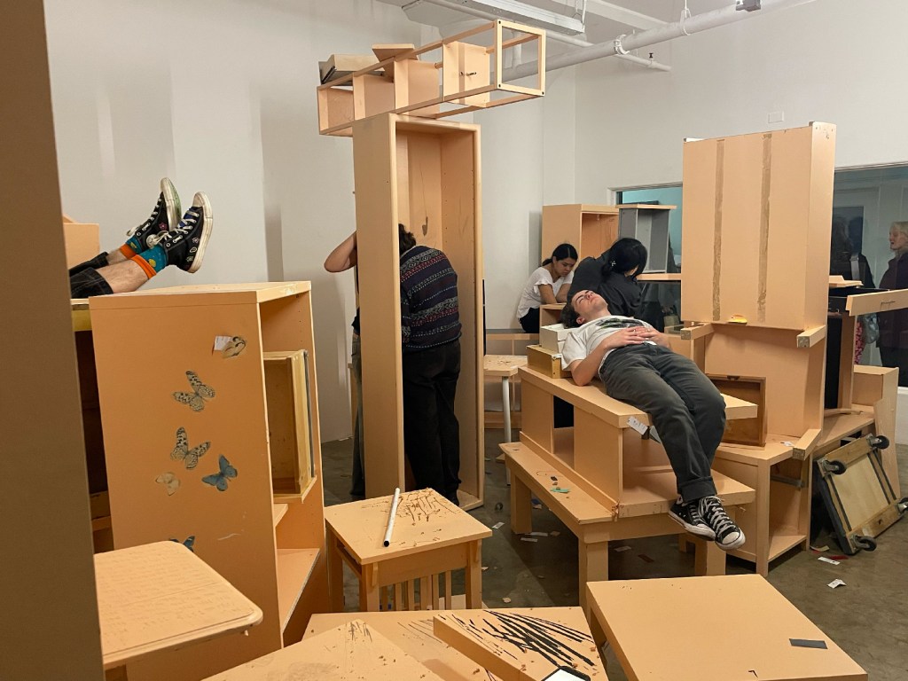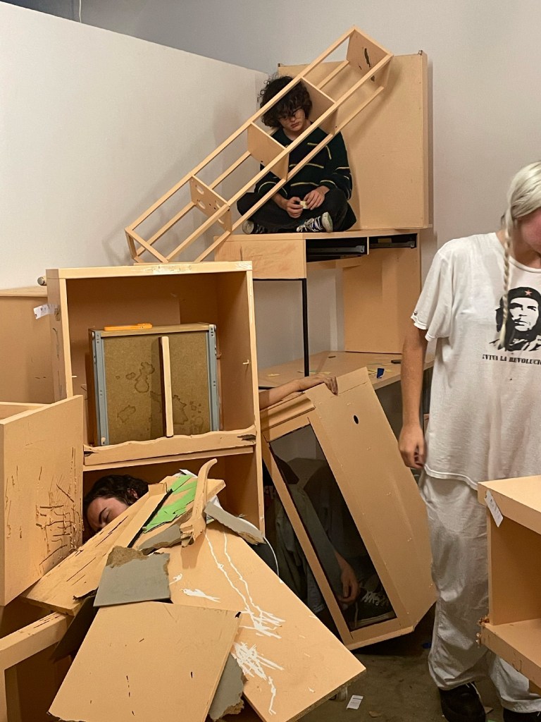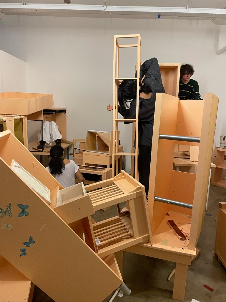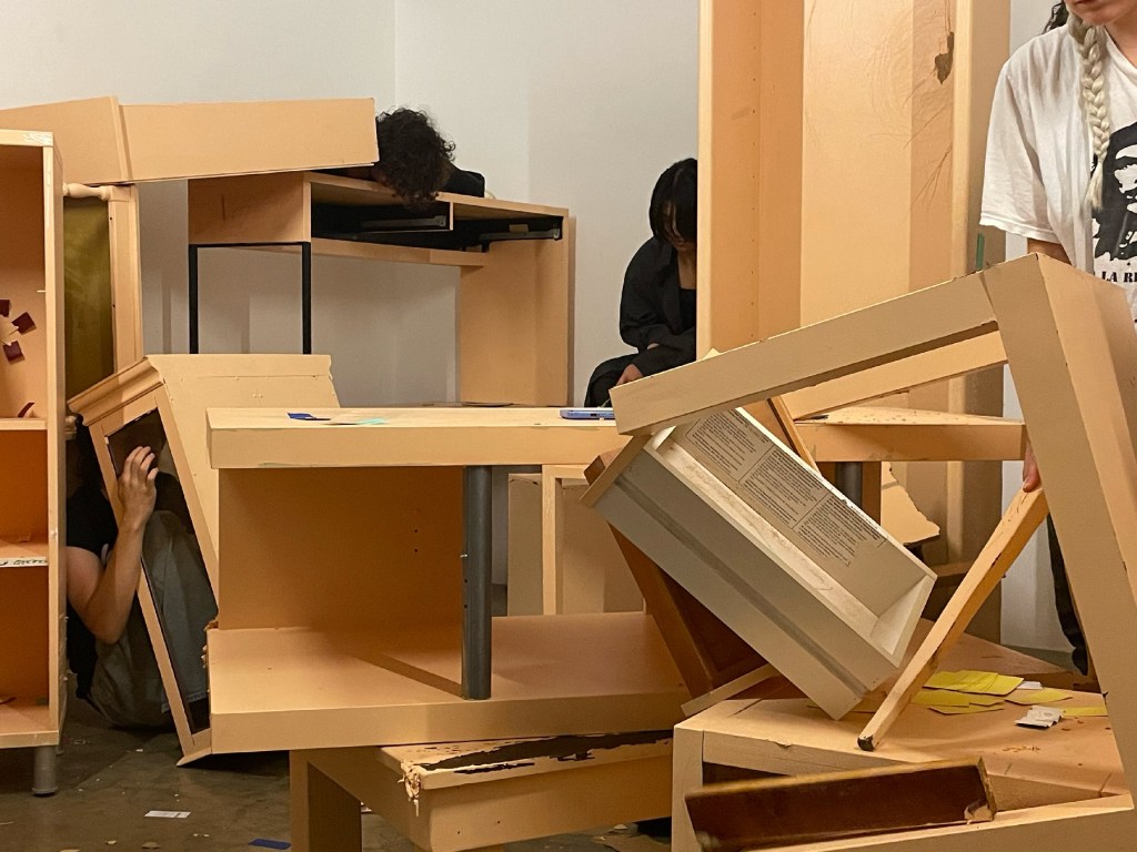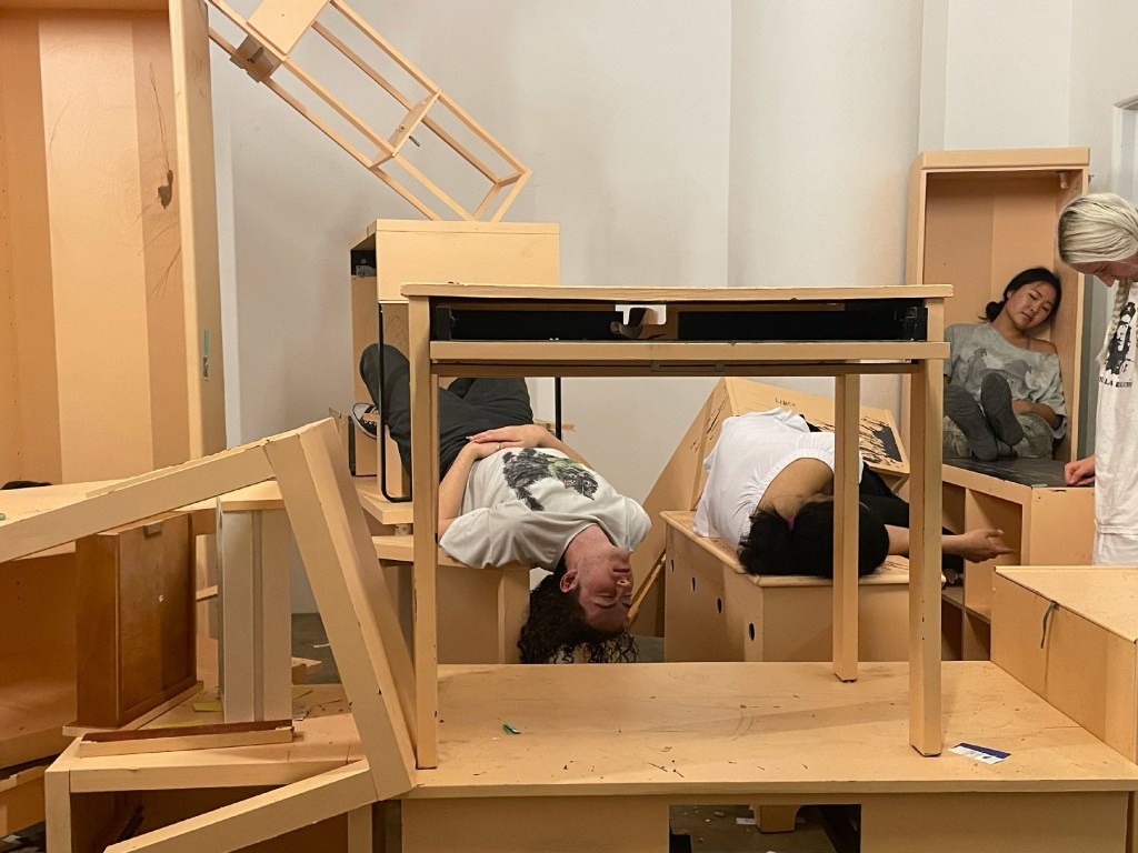 In this durational performance, participants were asked to make and find comfortable places to rest, and to desecrate the colored veneer of the painted furniture surface. They were given agency to move and dismantle furniture, as well as take breaks or walk away at any point. They are movers and breakers. They each came up with their own color of the year. Small swatches of each of these colors of the year can be seen scattered throughout the space by performers.