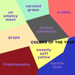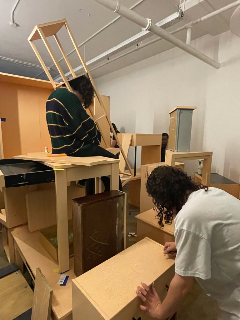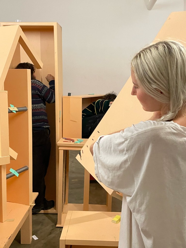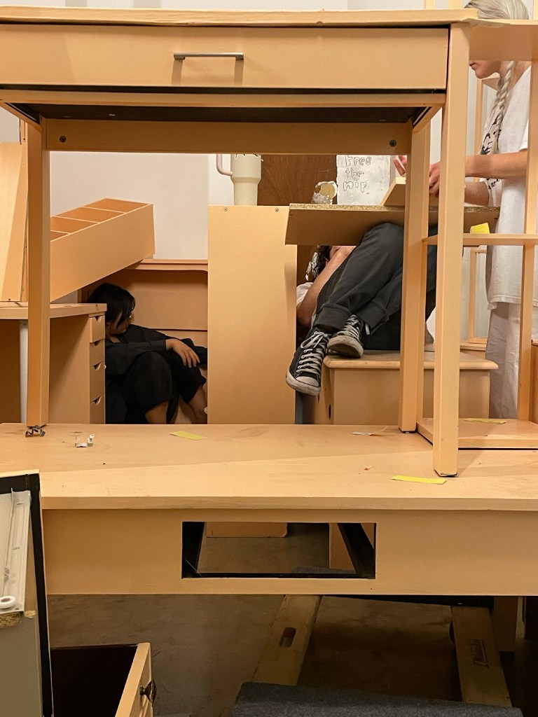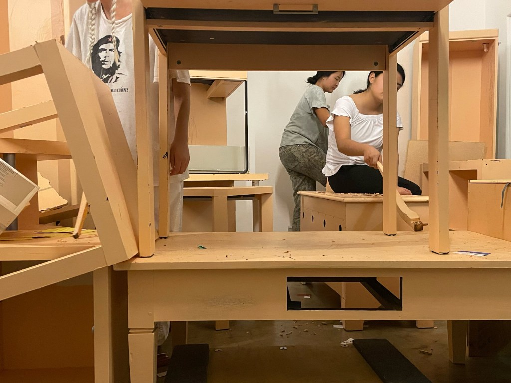 In this durational performance, participants were asked to make and find comfortable places to rest, and to desecrate the colored veneer of the painted furniture surface. They were given agency to move and dismantle furniture, as well as take breaks or walk away at any point. They are movers and breakers. They each came up with their own color of the year. Small swatches of each of these colors of the year can be seen scattered throughout the space by performers.