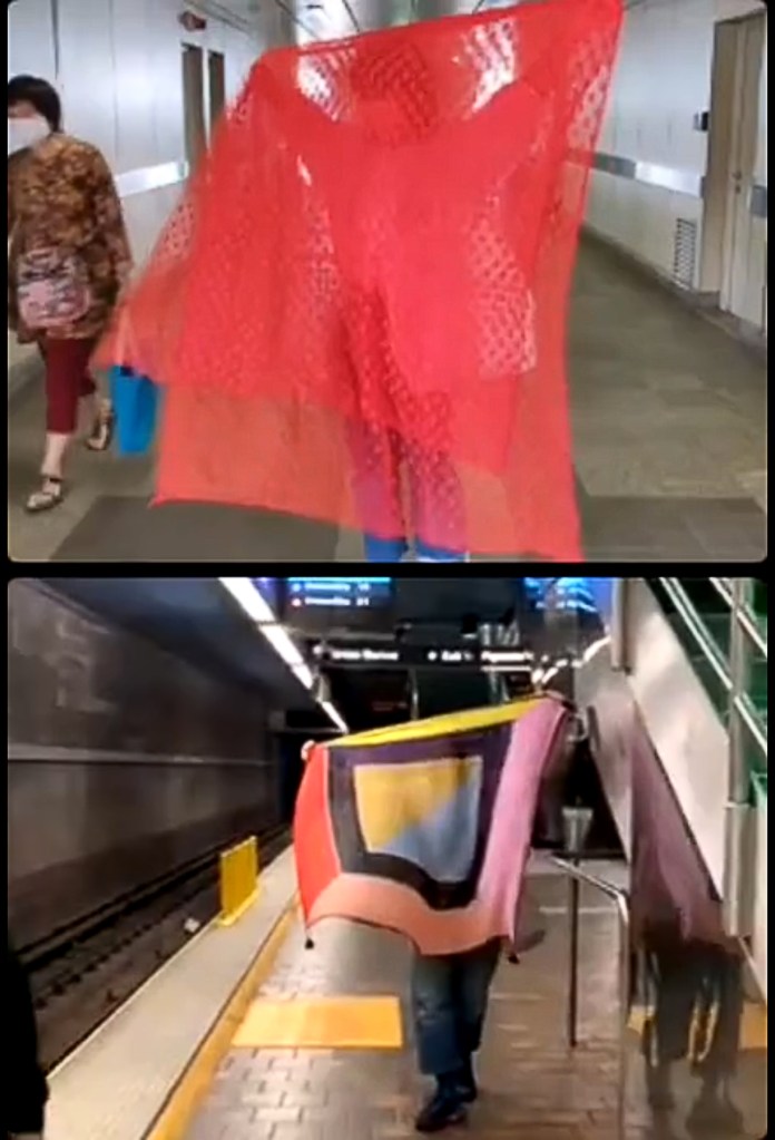 Kim Zumpfe and Wilawan Wiangthong performed on the same day and time in Bangkok and Los Angeles. Each performer travelled on the metro from an outlying area to the center of the city, where the performance continued in Bangkok at Mochit Bts station and in Los Angeles at Union Station. These performances were live-streamed together on IGTV to examine the relation of social media to the understanding of place, and as a modality that shows the functions, failures, and loss of ability to relate and engage between actual space and digital space. Tensions between fabrics and body were enacted as resistant behaviors in relation to the constructs of the city. Previously owned fabrics gathered from our respective cities are intended as multi-dimensional: a transformation of the body within limiting environments, the pliability of exteriors that occur between overlapped lives within metropolitan cities, an impression of the politics of self-portrayal from the unseen lives that previously wore them, and the respective symbolism of the colors and designs. We travel from outlying areas to centers. We travel from exteriors to interiors. This performance occurred with the backdrop of Democracy protests in Bangkok & with post-election events in Los Angeles.