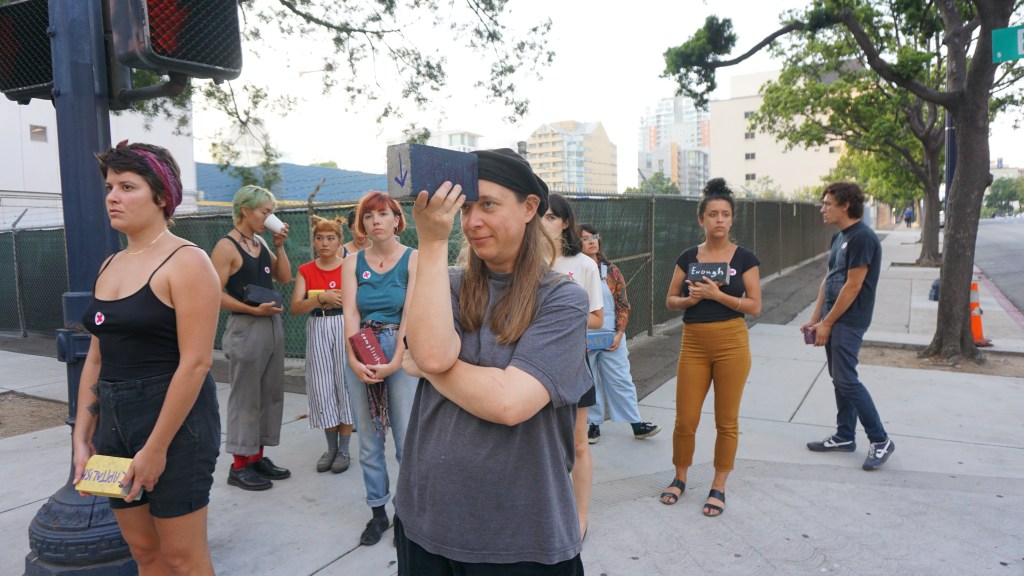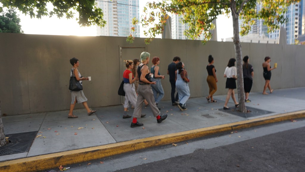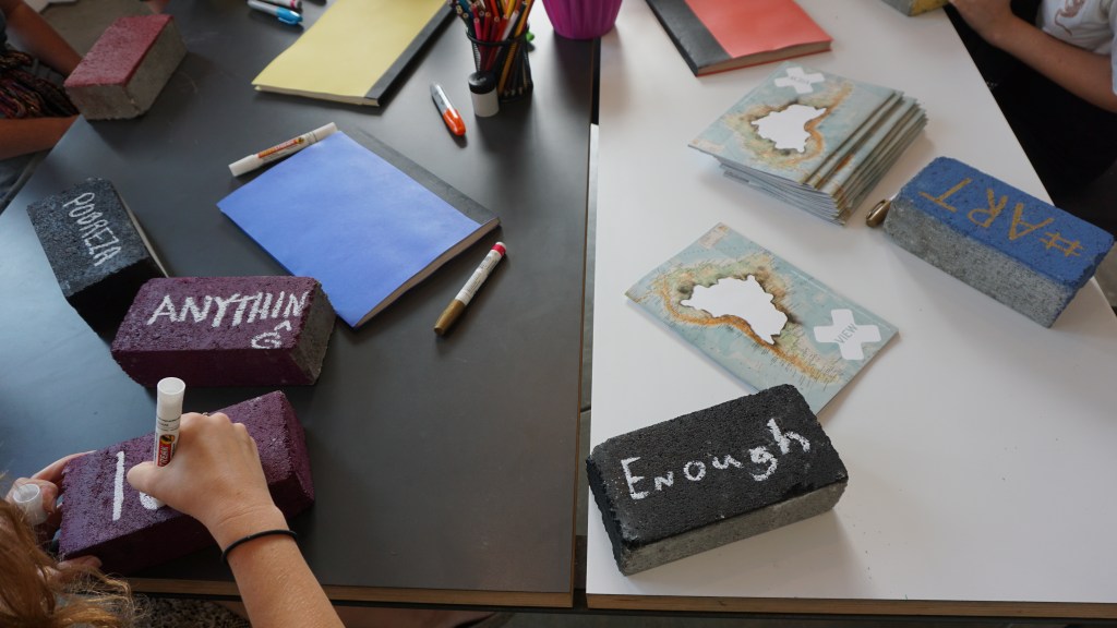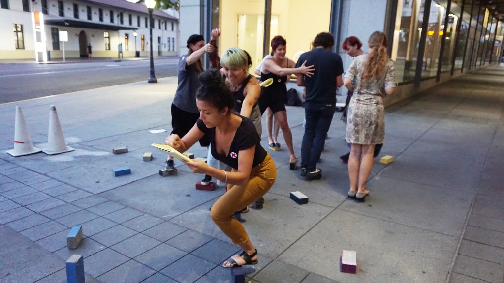us in precarity; words against reason was developed in collaboration with Meital Yaniv as a performance and experimental workshop constructed to address and foster counter strategies in writing and using words, particularly in relation to the idea of precarity. Writing was addressed as a space of working together and as a shared time for dealing with how power works in emotional lives. This workshop included a group discussion about how to find alternate forms and practices in writing, a free-writing session, a walk in the city with bricks, and a group reading exercise that included finding ways to keep each other from falling when on precarious foundations. A final group activity was structured around the question, “What should we do next?”