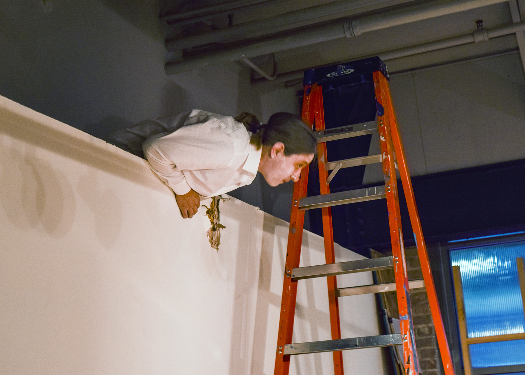 The installation/exhibition space was scored in a continuous line with the edge of crow bar in a complete vertical circumference in the exhibition space. The split started on the floor, up a wall of the exhibition space, behind that wall where I scaled down a 12-foot drop with rope and back up again, across a 16-foot ceiling where I had to negotiate pipes, a ventilation system, and climb up part of the physical installation, and back down to the floor. I built temporary platforms to reach difficult to reach parts of the ceiling and walls. When the circumference was scored/split, I marked myself, splitting myself with a black line in a circumference around my body.